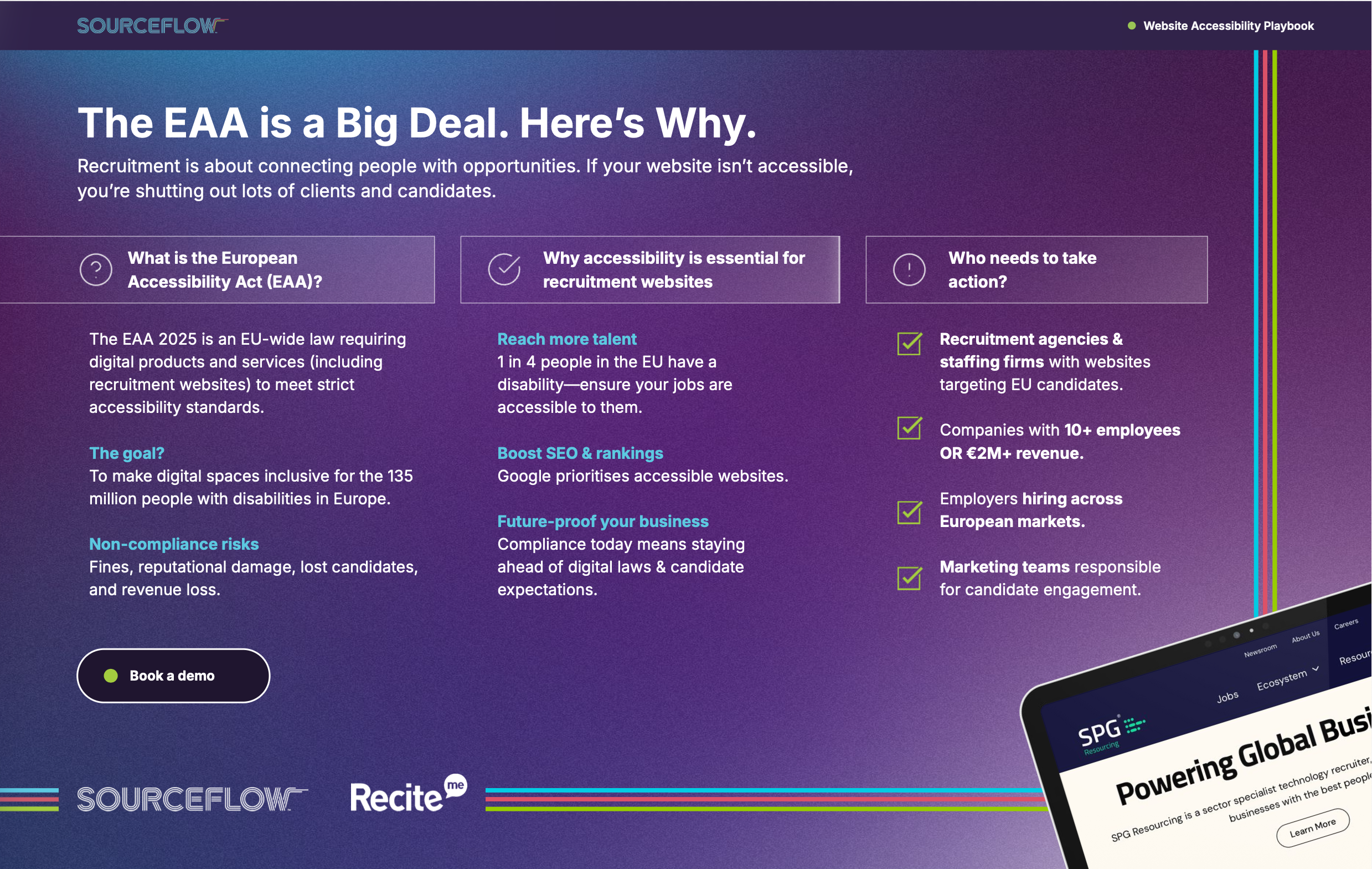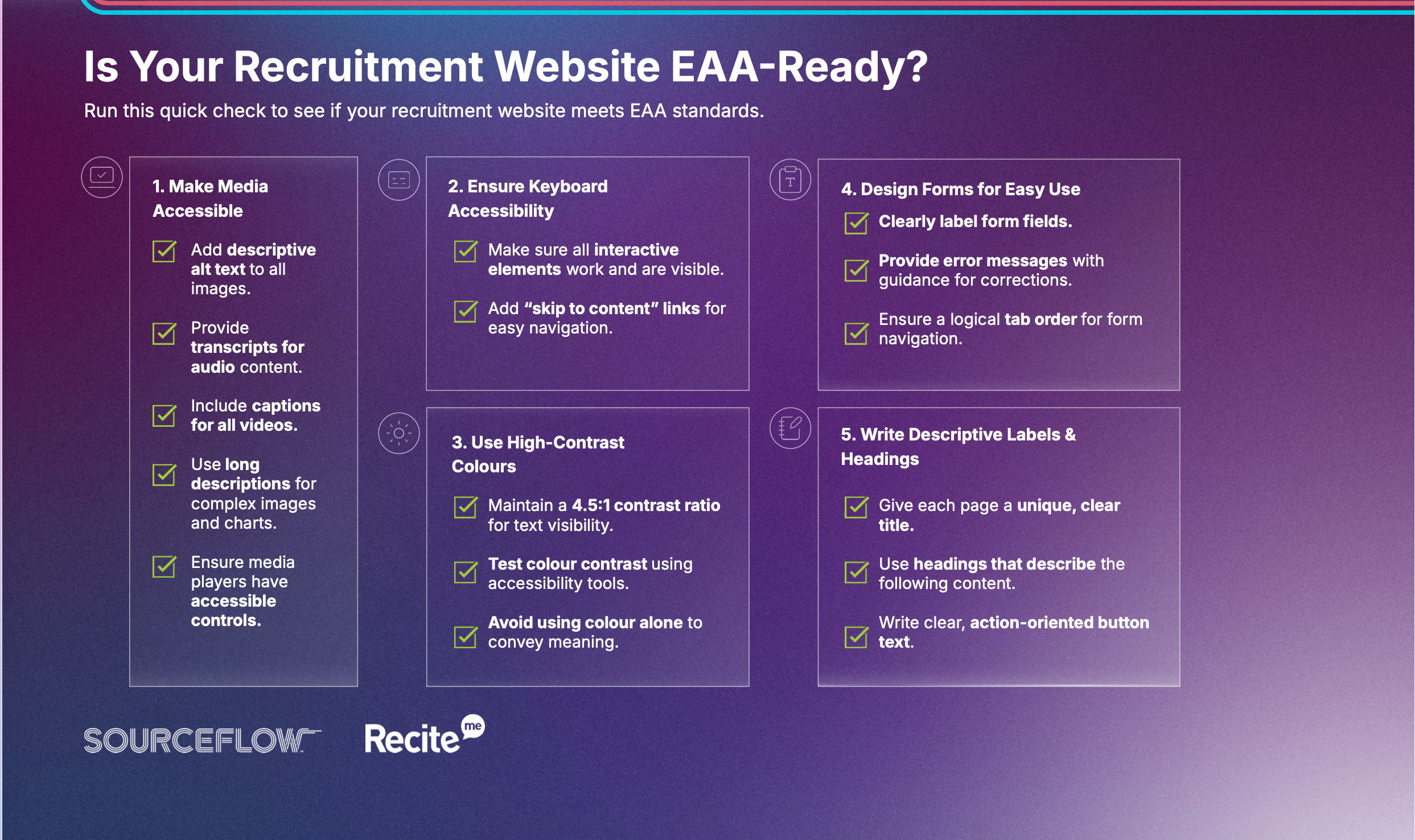 Download SourceFlow’s free guide to building an inclusive recruitment website that meets global accessibility standards and widens your talent pool.